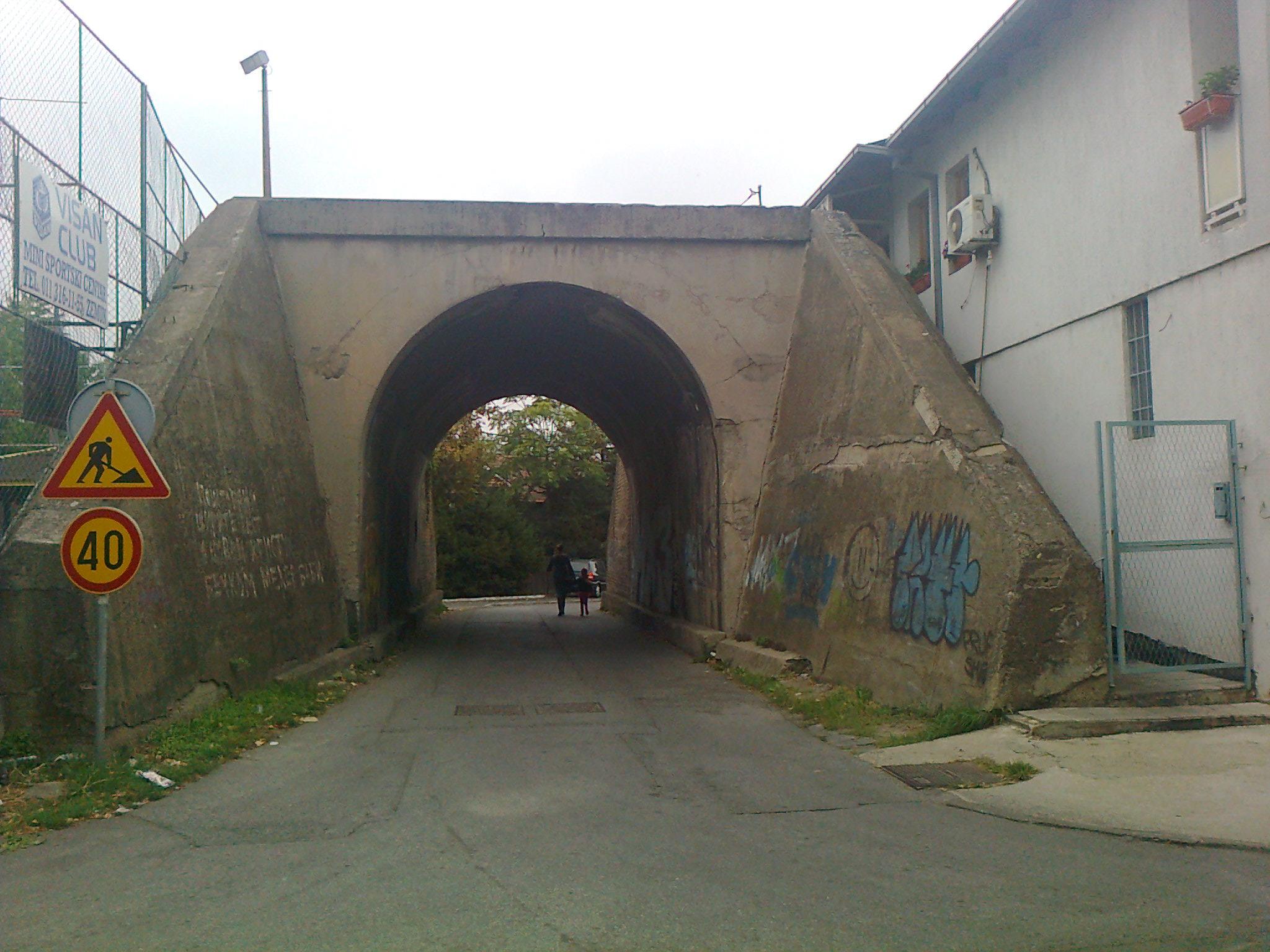 Пружни насип и пруга које више нема, некада и сада, са тунелом кроз који пролази улица Радоја Дакића испод некадашње пруге.